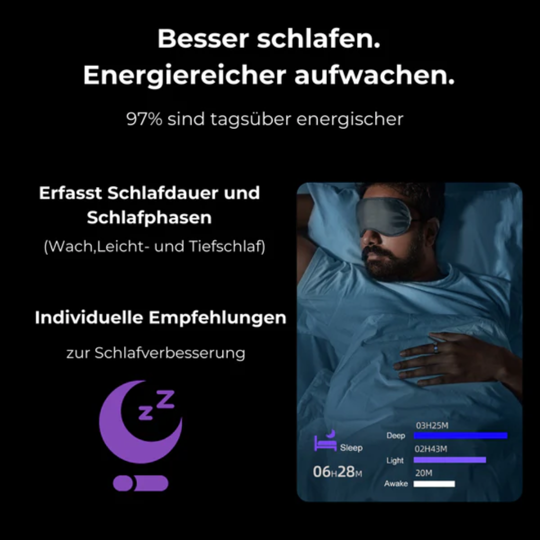 Der Smart Ring trackt deine Schlafphasen und gibt individuelle Empfehlungen, damit du ausgeruhter und energiegeladener aufwachst.